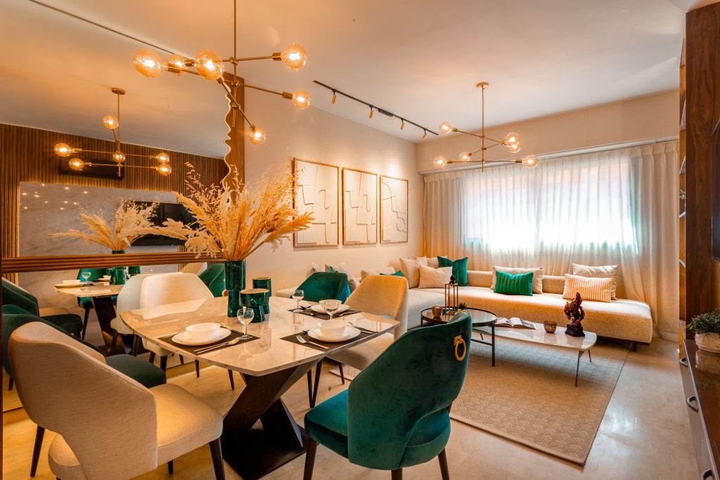 - Les équipements installés : îlot central, électroménager haut de gamme, luminaire.
